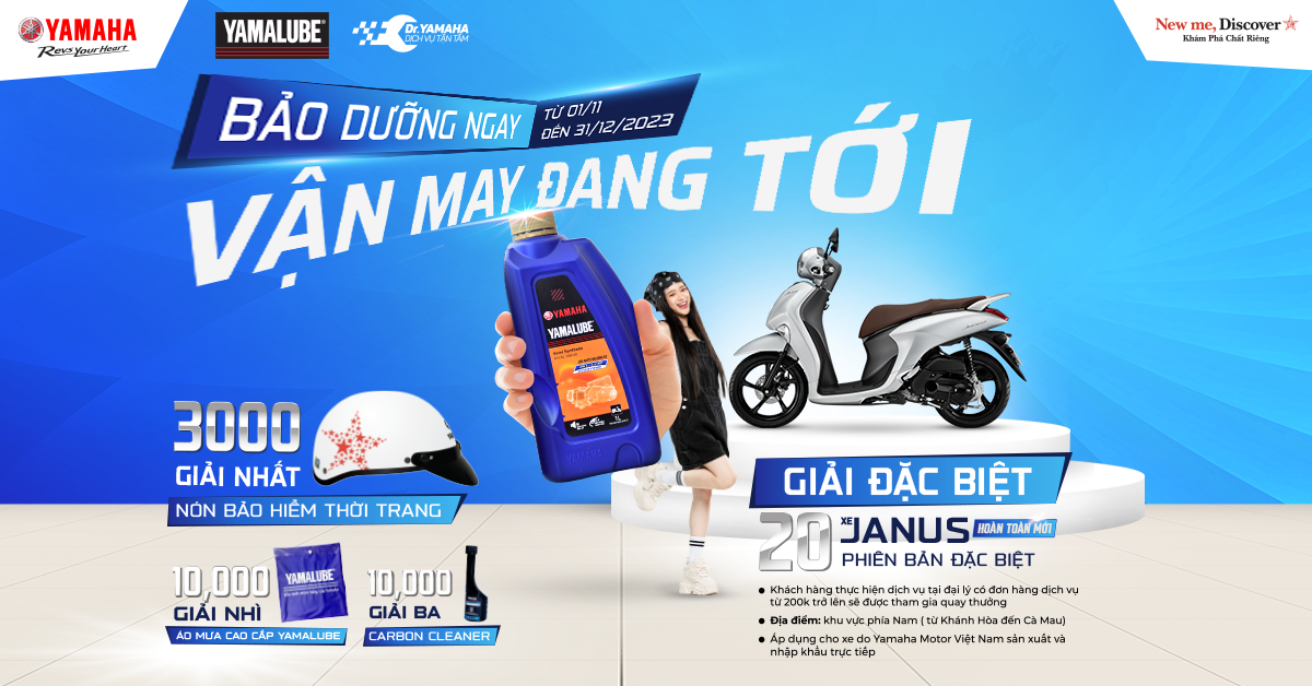 Yamaha Town Thanh Vương Phát xin trân trọng thông báo chương trình khuyến mại “BẢO DƯỠNG NGAY - VẬN MAY ĐANG TỚI” từ ngày 01/11/2023 đến ngày 31/12/2023 dành cho khách hàng đến và sử dụng các dịch vụ của Thanh Vương Phát.