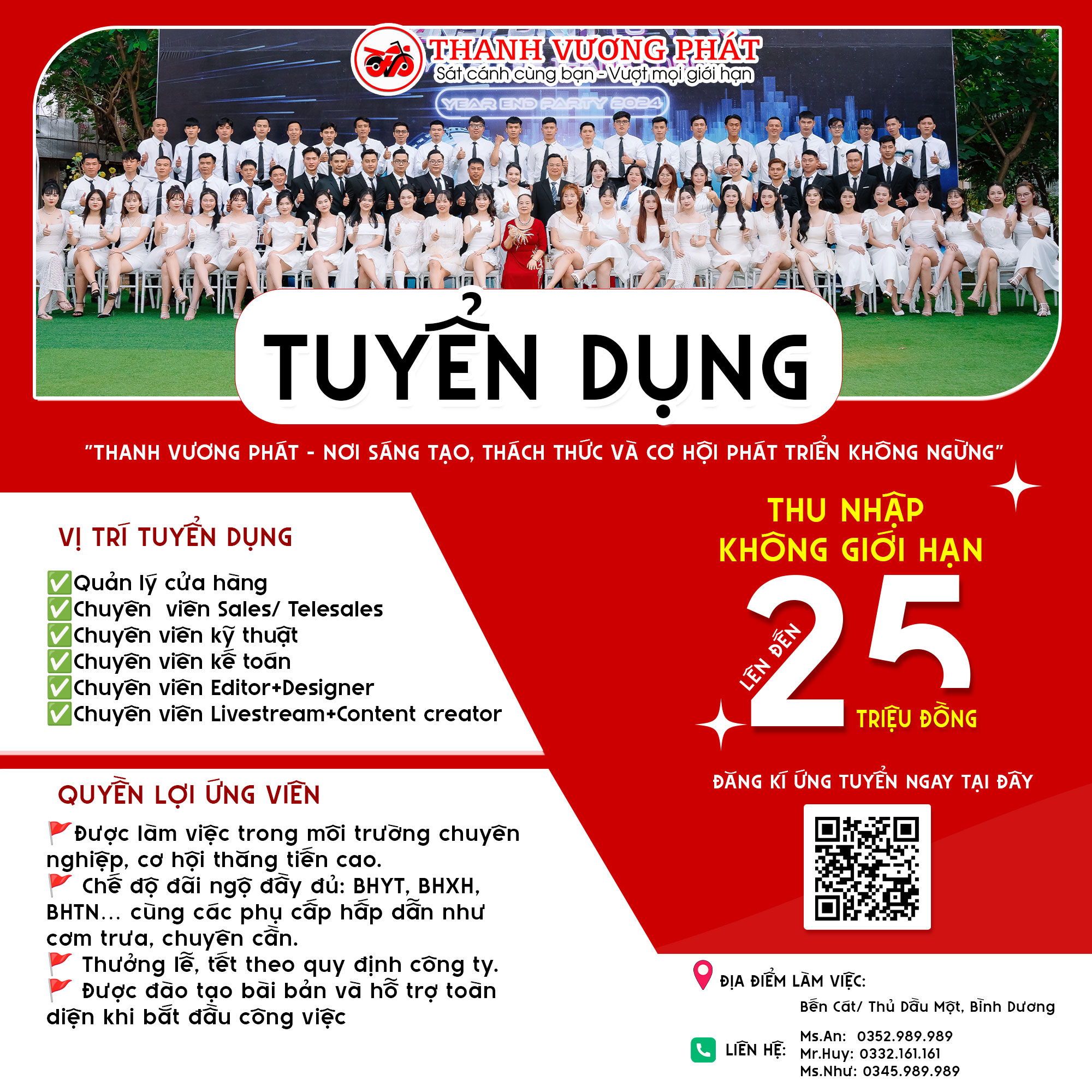 Chúng tôi luôn tìm kiếm những ứng viên tài năng, đầy nhiệt huyết và mong muốn phát triển lâu dài. Nếu bạn là người đam mê công việc và muốn gia nhập một môi trường làm việc chuyên nghiệp, sáng tạo thì Thanh Vương Phát chính là nơi dành cho bạn với: