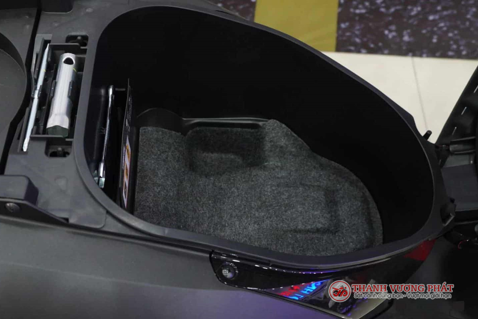 Cốp xe được phủ thảm cao cấp, giúp dễ dàng vệ sinh, hạn chế sức nóng từ của động cơ nhằm tránh ảnh hưởng tới các vật dụng trong cốp.