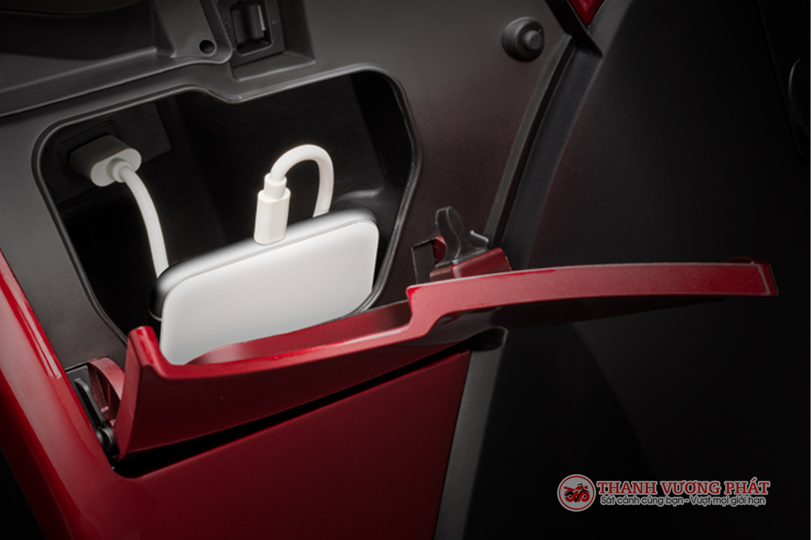 Hộc để đồ phía trước bên trái được trang bị trên dòng xe Sh mode với dạng nắp mở, tích hợp cổng sạc USB vô cùng tiện lợi.