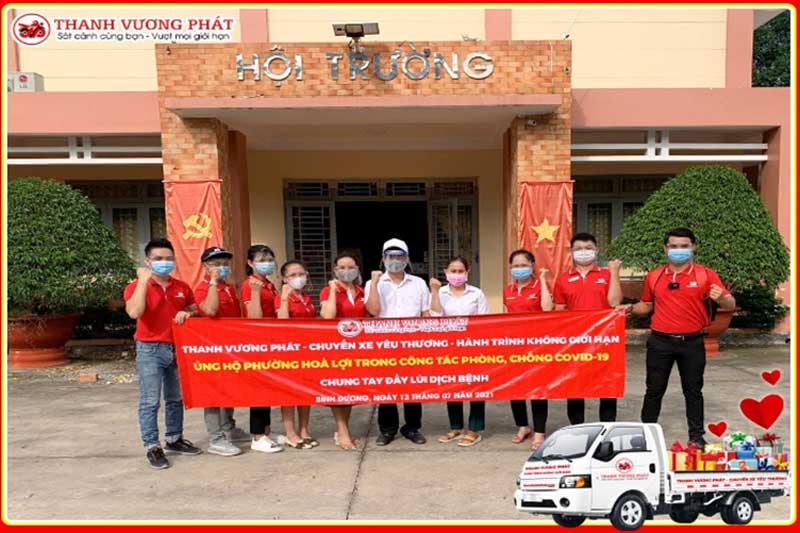 Trưa ngày 13/07/2021, BLĐ Thanh Vương Phát cùng kết hợp với Phường Hòa Lợi trao tặng những phần quà thiết yếu cho lực lượng tuyến đầu chống dịch. Các phần quà bao gồm 1 tấn gạo, 500 kg rau tươi, 150 thùng mì tôm, 200 hộp khẩu trang, 100 chai nước sát khuẩn, 50 thùng nước suối.