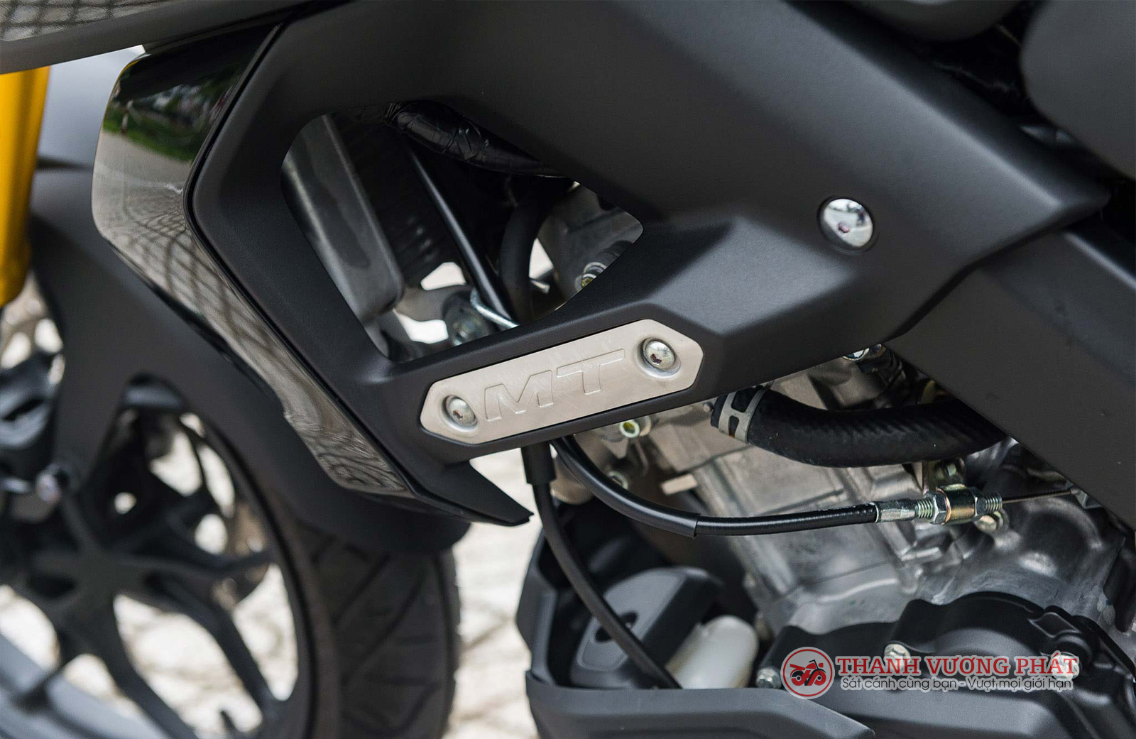 Khung sườn của xe vẫn là loại Deltabox như đời trước. Bên hông xe, các chi tiết ốp nhựa được thiết kế khá táo bạo, ví dụ như ở đây anh em có thể thấy một thanh bắt qua như thế này, ốp lên 1 miếng nhôm và khắc chữ MT, giúp tạo điểm nhấn cho cái nhìn từ bên hông.