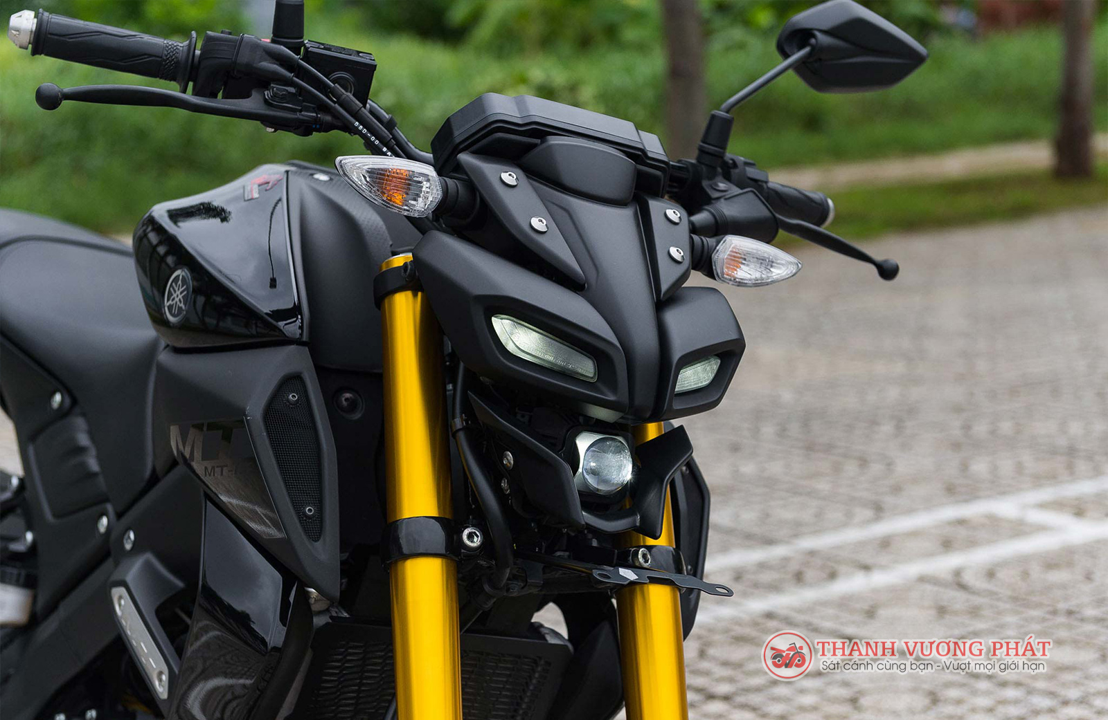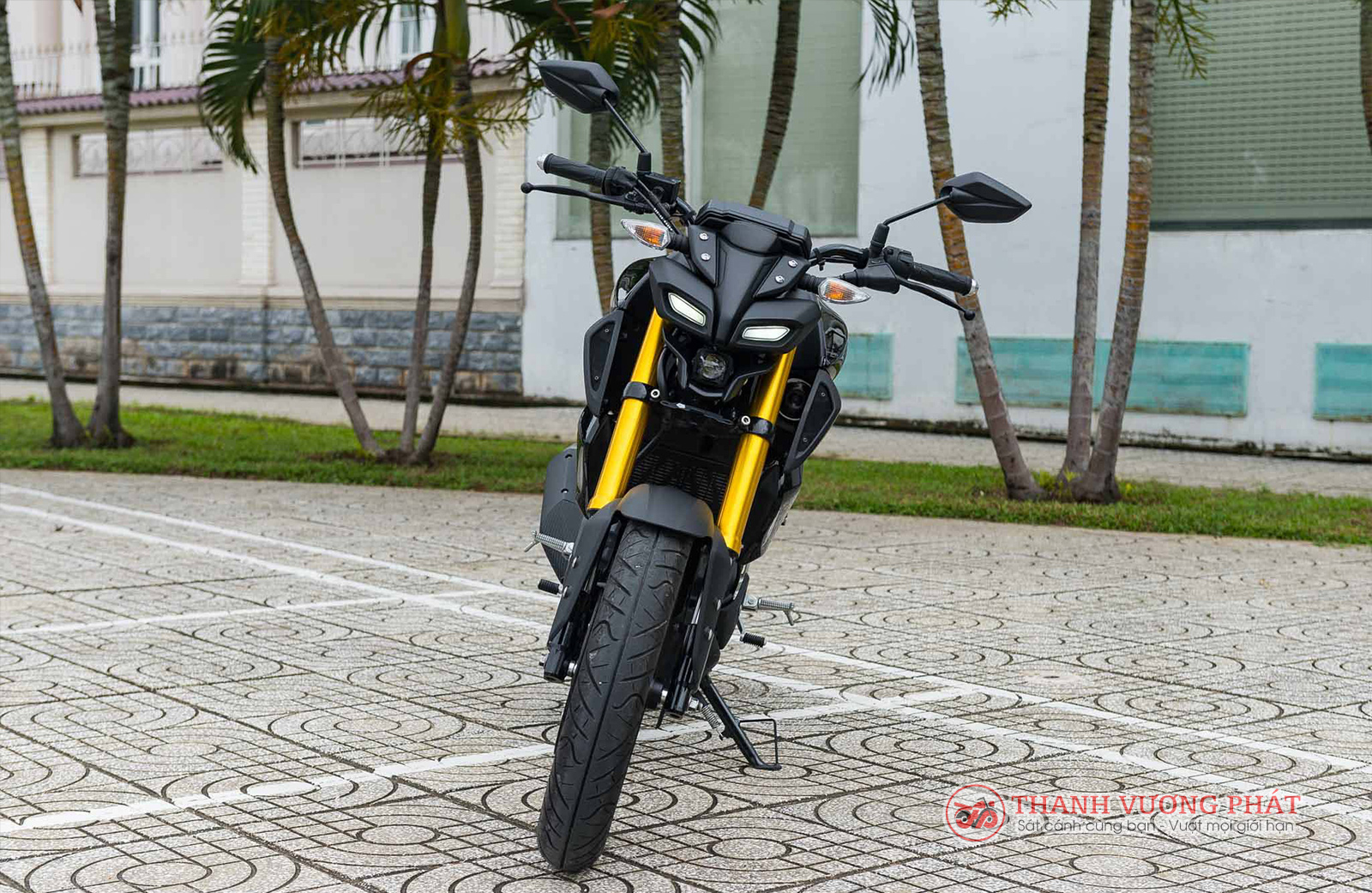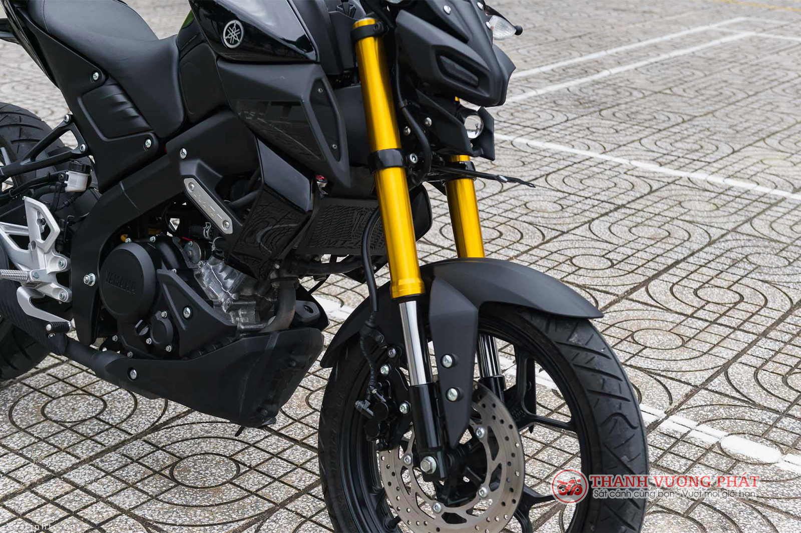 Từ phía trước, yếu tố giúp cho chiếc xe trở nên rắn chắc đó chính là cặp phuộc USD màu vàng với kích thước với đường kính 37mm, hành trình phuộc 130mm.