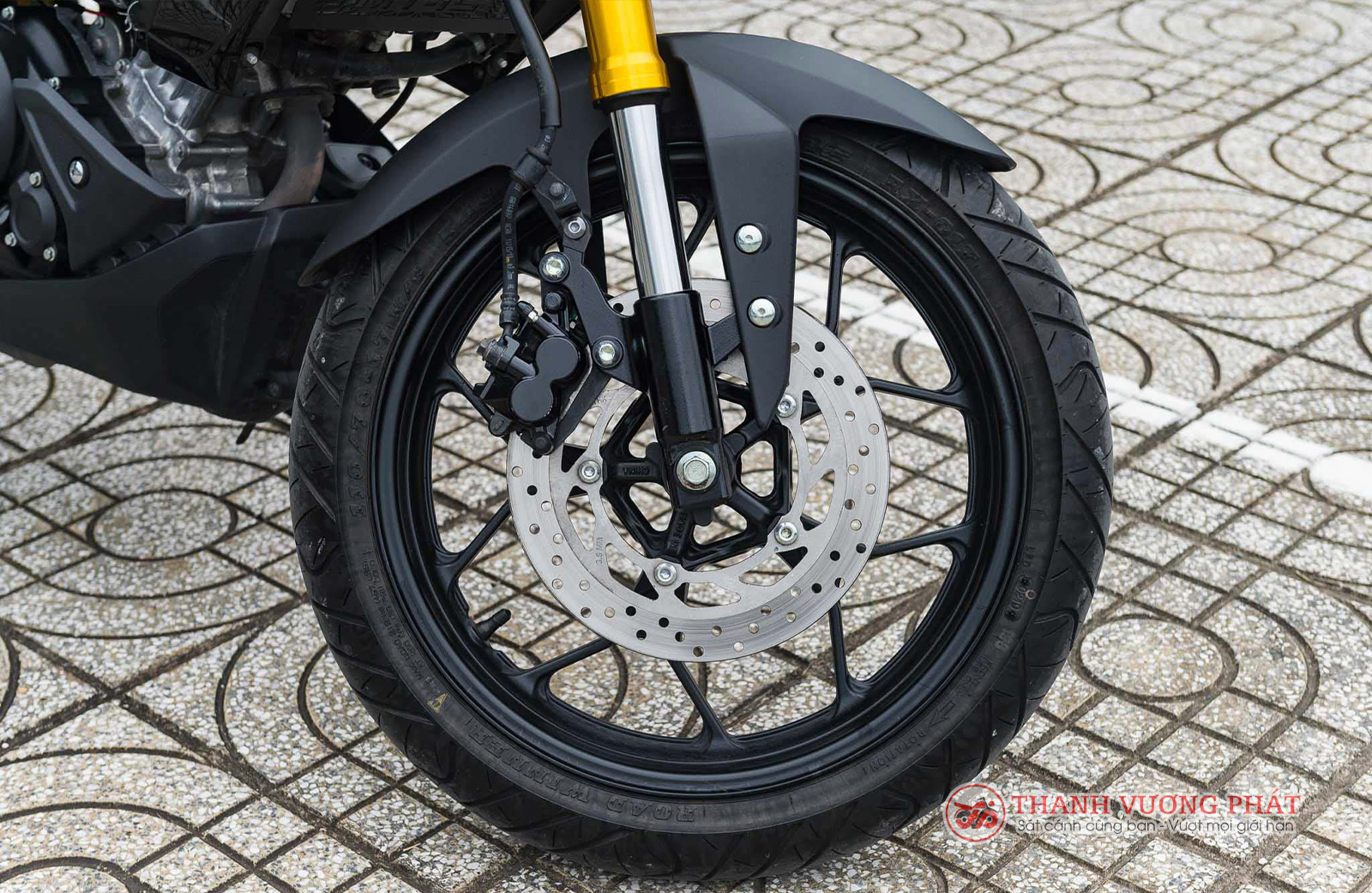 Mâm xe phía trước là dạng 5 chấu kép có đường kính 17 inch, kích thước lốp 110/70. Phanh đĩa trước đĩa đơn, 292 mm, cùm phanh sơn đen không rõ sản xuất bởi hãng nào.